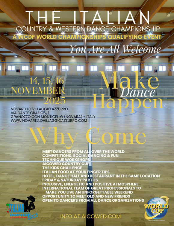 Per tutti coloro che volessero avvicinarsi al mondo delle gare, l'Aicowed Country Cup potrebbe essere il primo passo in un ambiente accogliente, amichevole, con l'atmosfera delle grandi occasioni resa frizzante dall'adrenalina, connotata da sportività e rispetto per i concorrenti sulla pista da ballo senza perdere di vista la voglia di divertirsi, di conoscere persone e fare nuove amicizie.